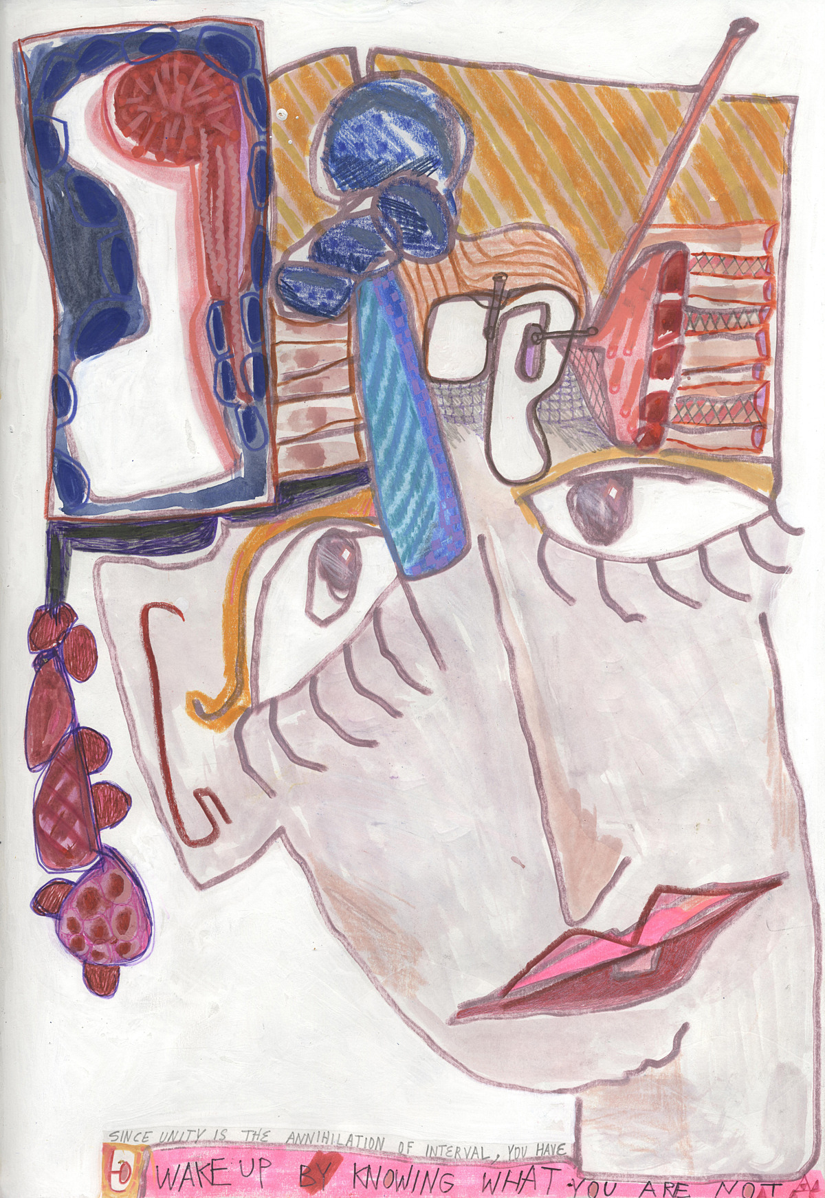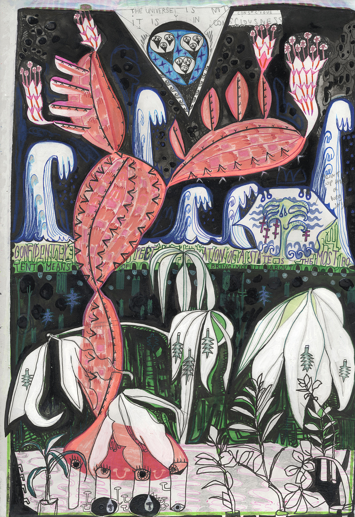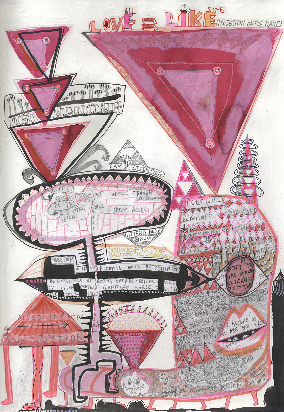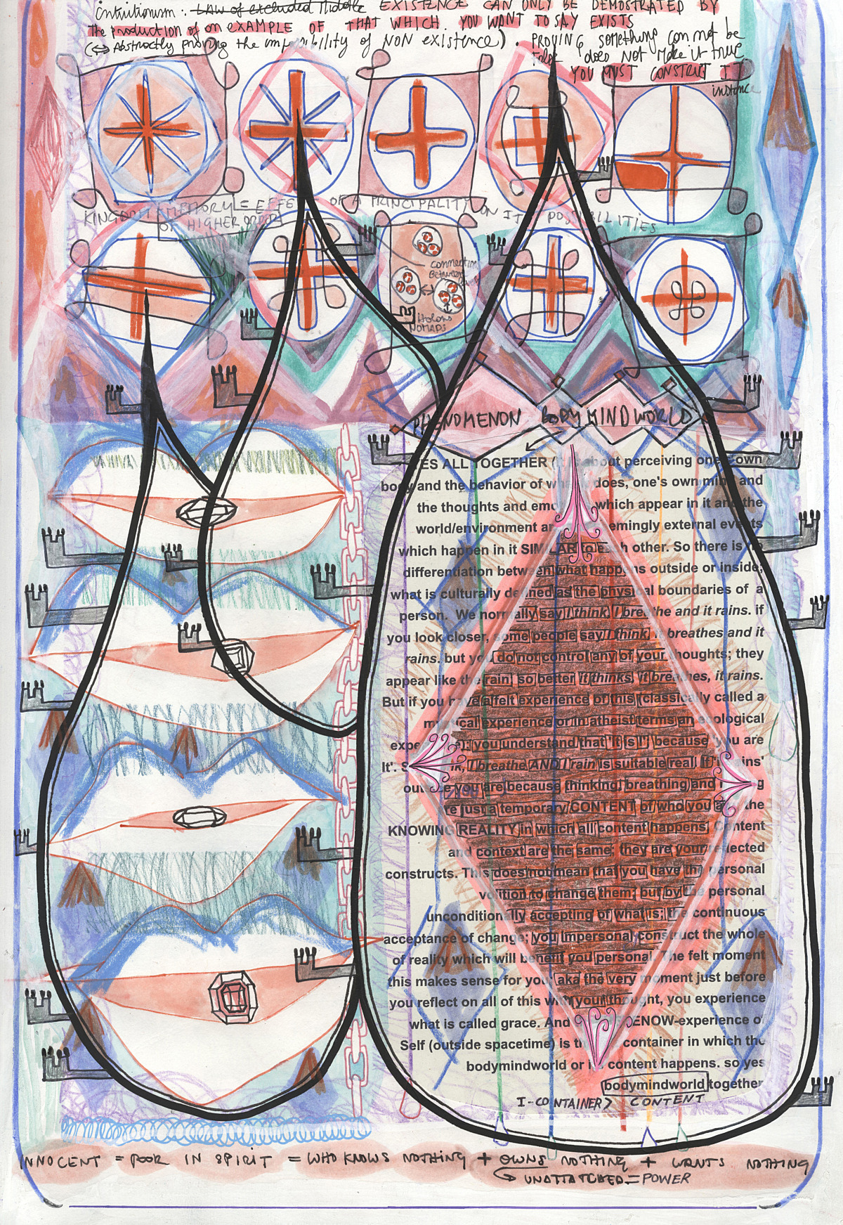 Selection of drawings & writings in A3 sketchbook.Intuitive compositions layered by opinions & various quotes.In search for truth; focusing on the metaphysics of space, time, personal agency & our relationship with consciousness.