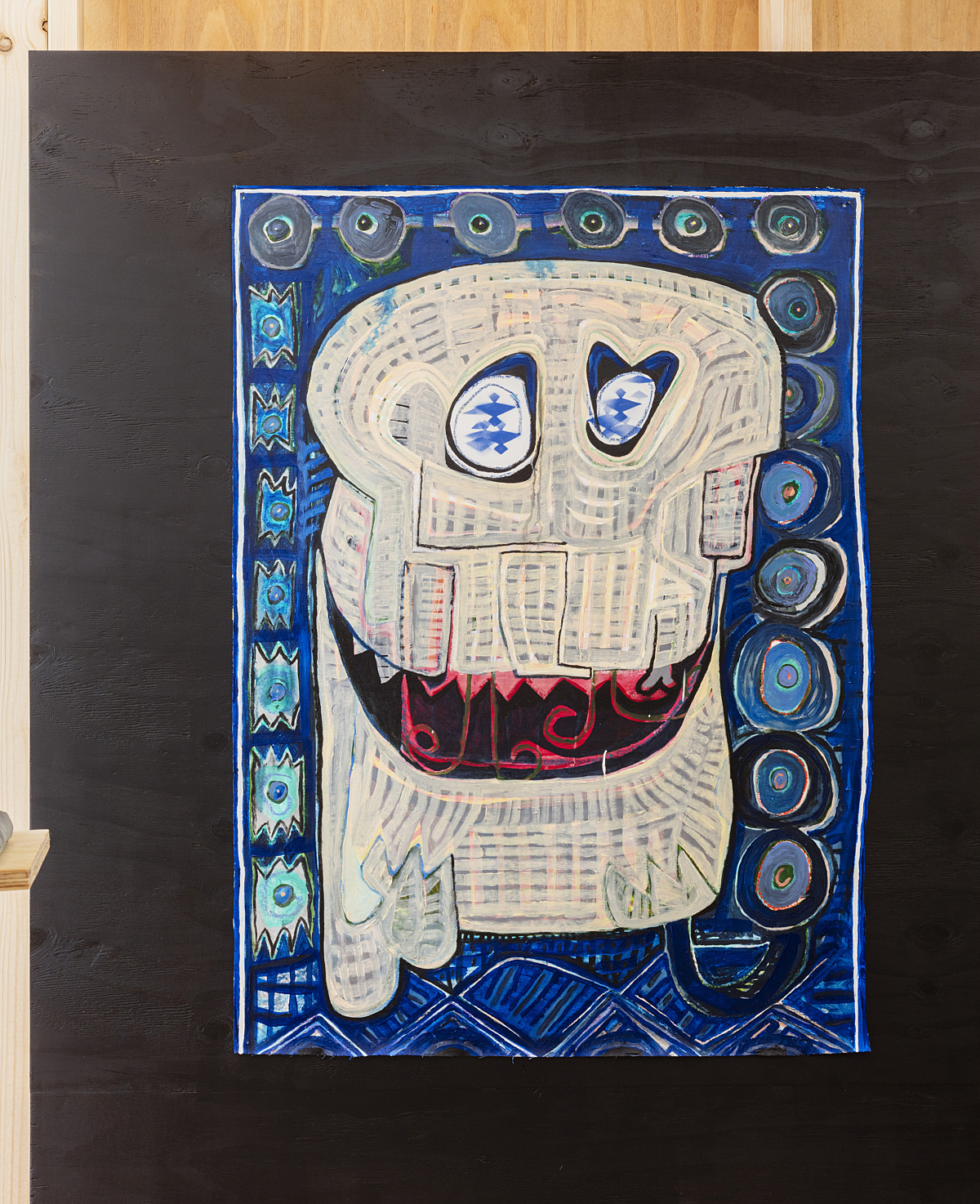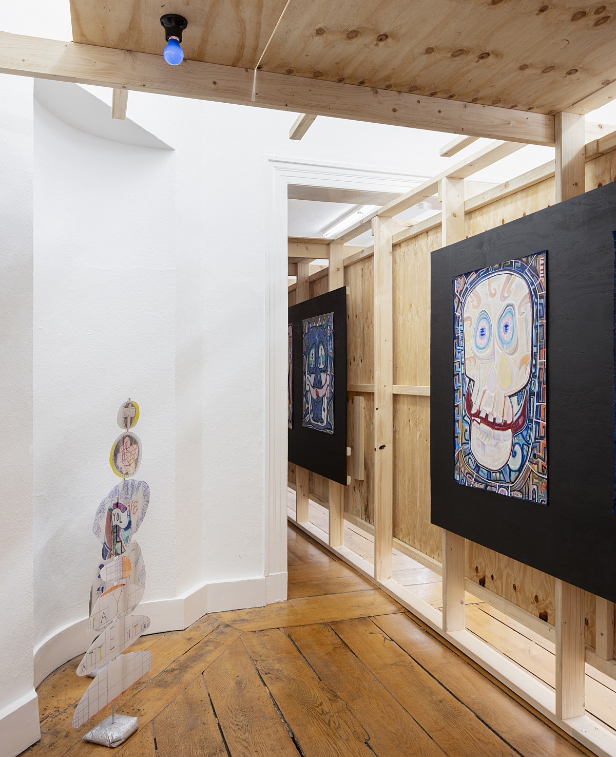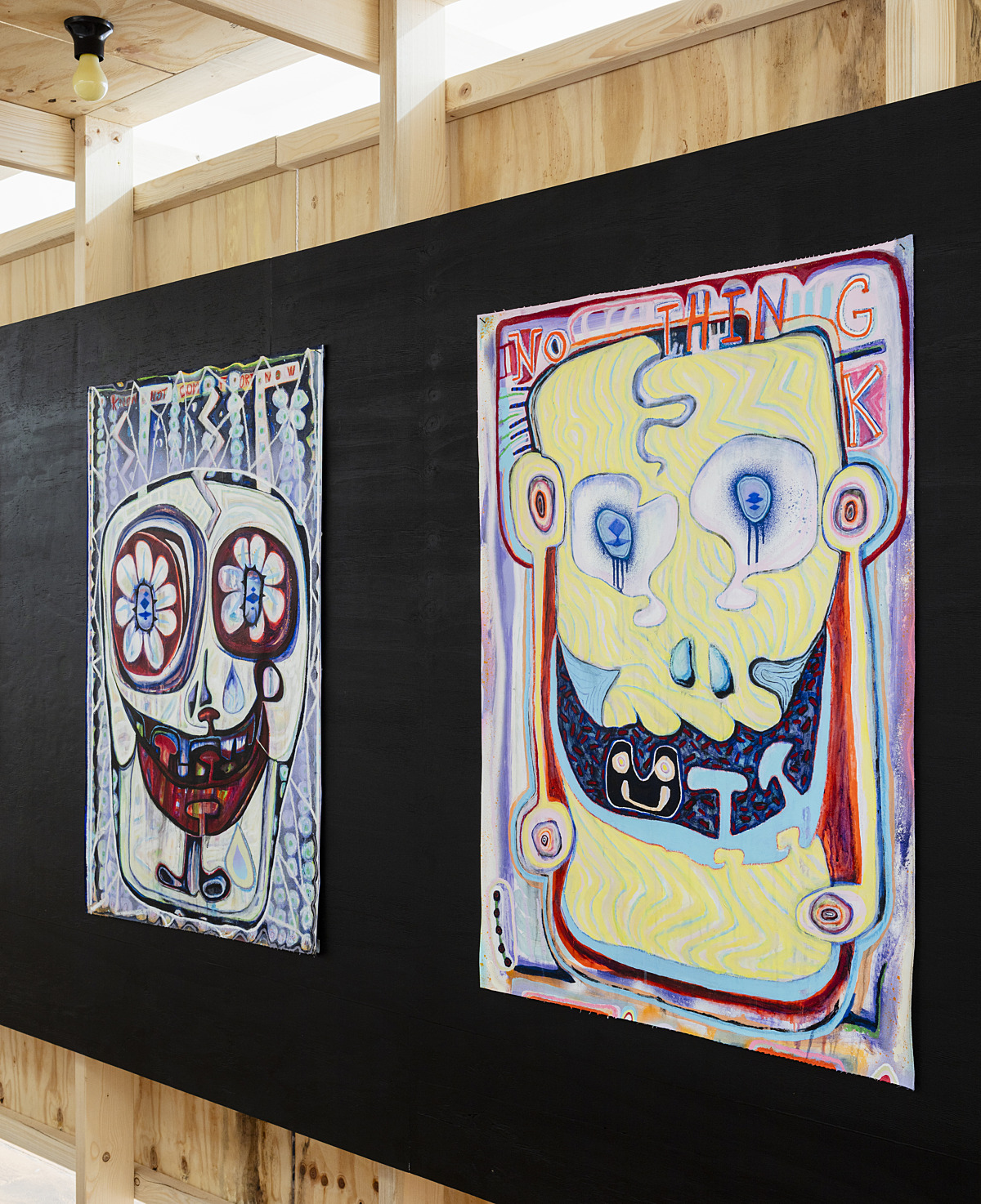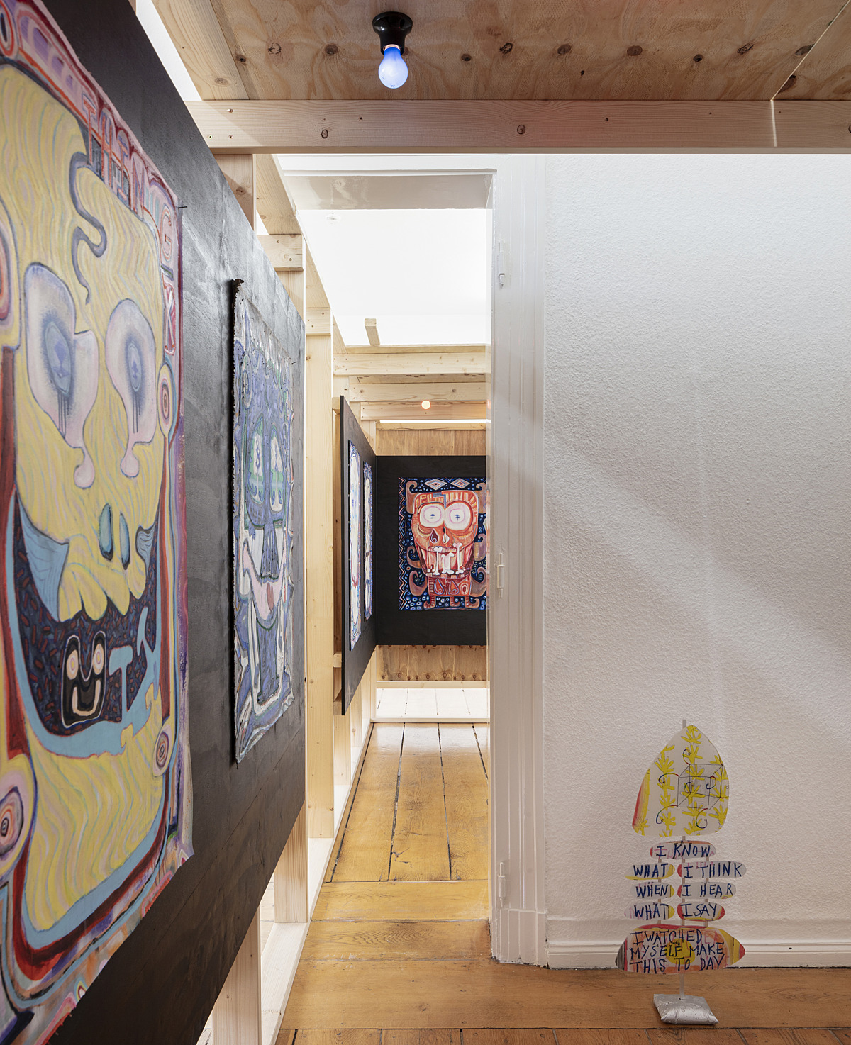 INVERSE, YOUNIVERSE A wooden structure connects and divides. The visitor enters a narrow, sunken space. A series of paintings unfolds along a new wall: Happy Harvest (2023-2024), 12 smiling, pastel-colored skulls. The distance between the painting and the visitor becomes very small. This proximity forces visitors to look closely at the works and expose themselves to them.