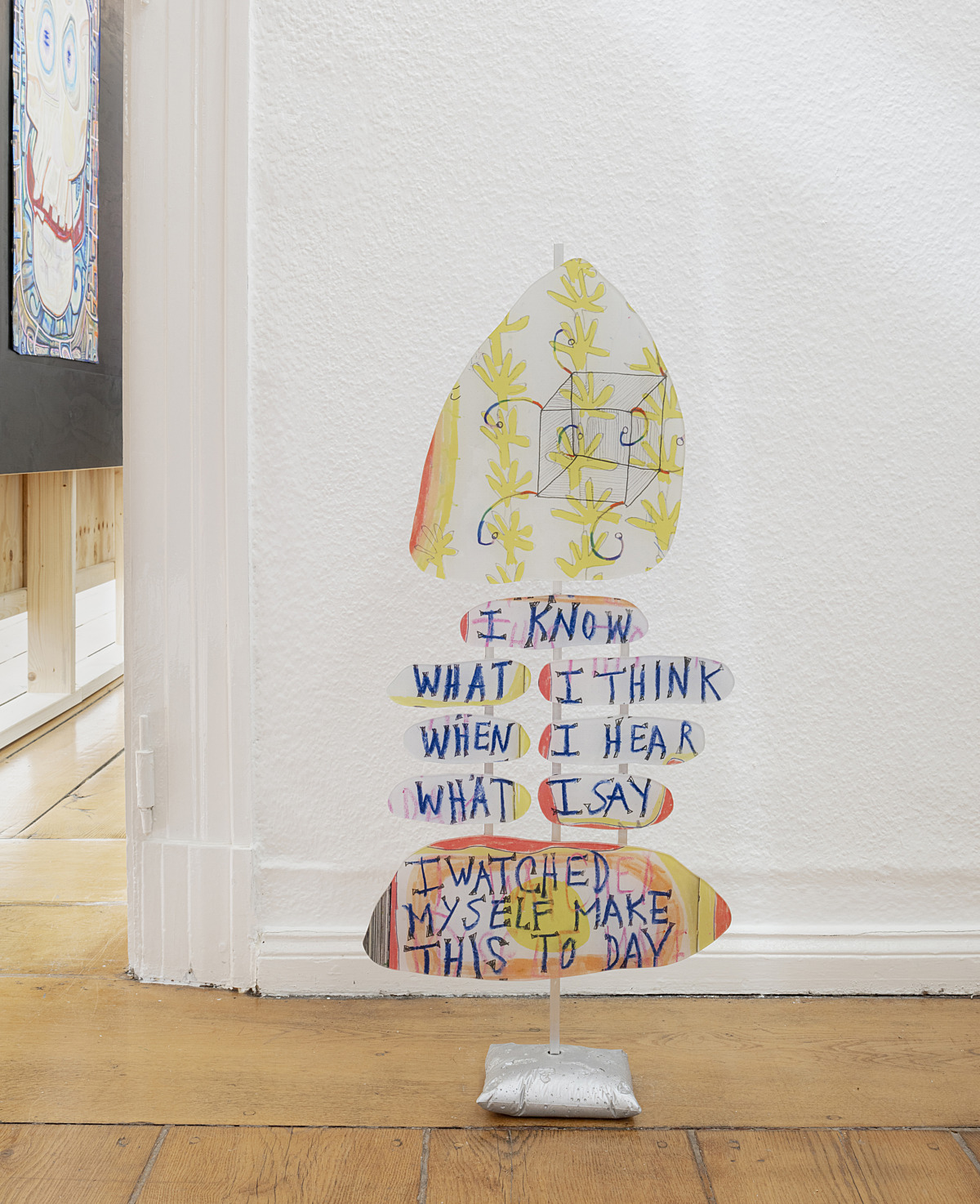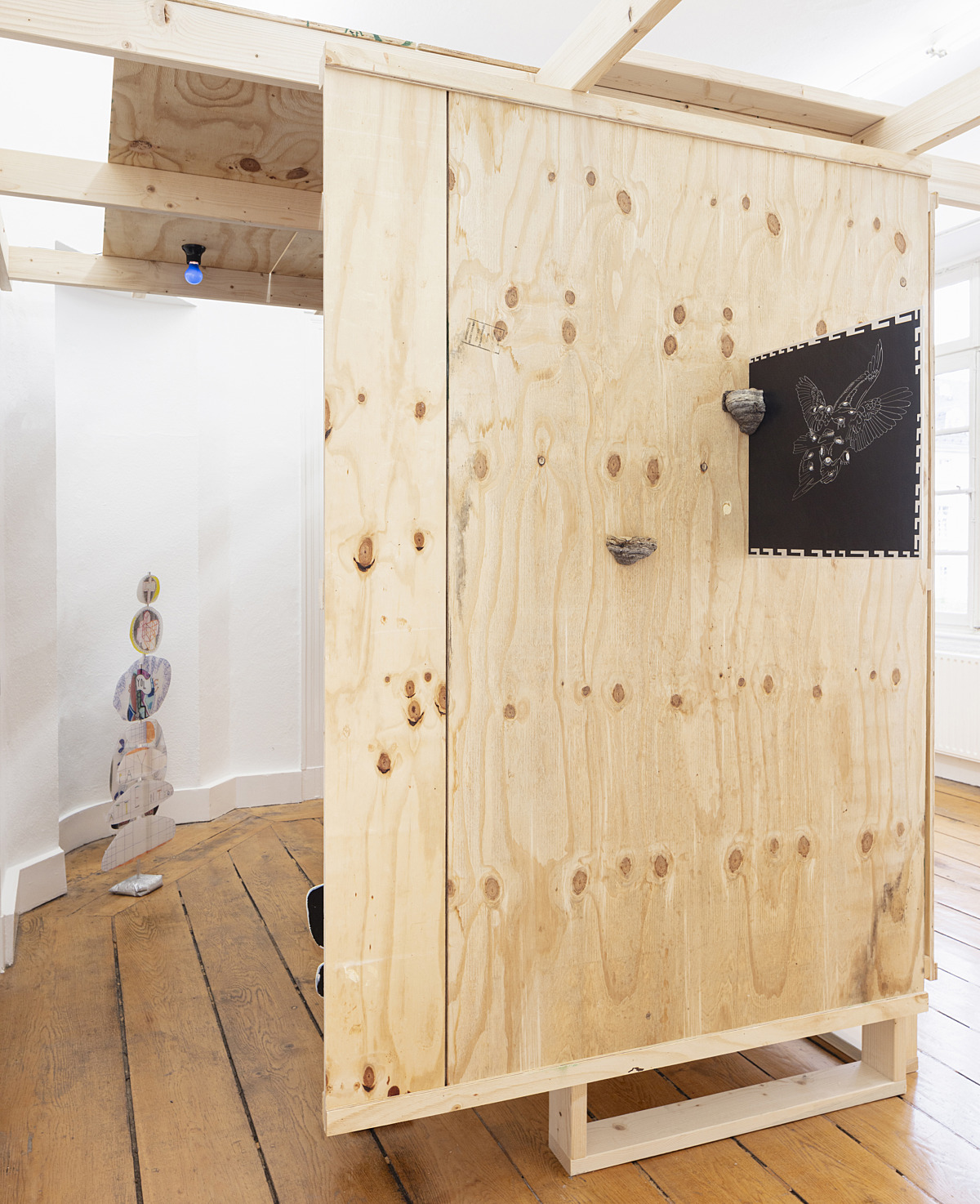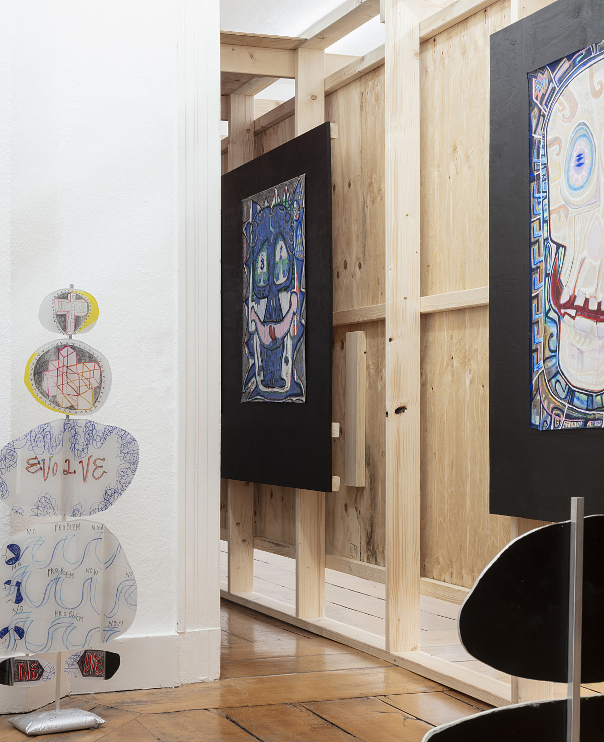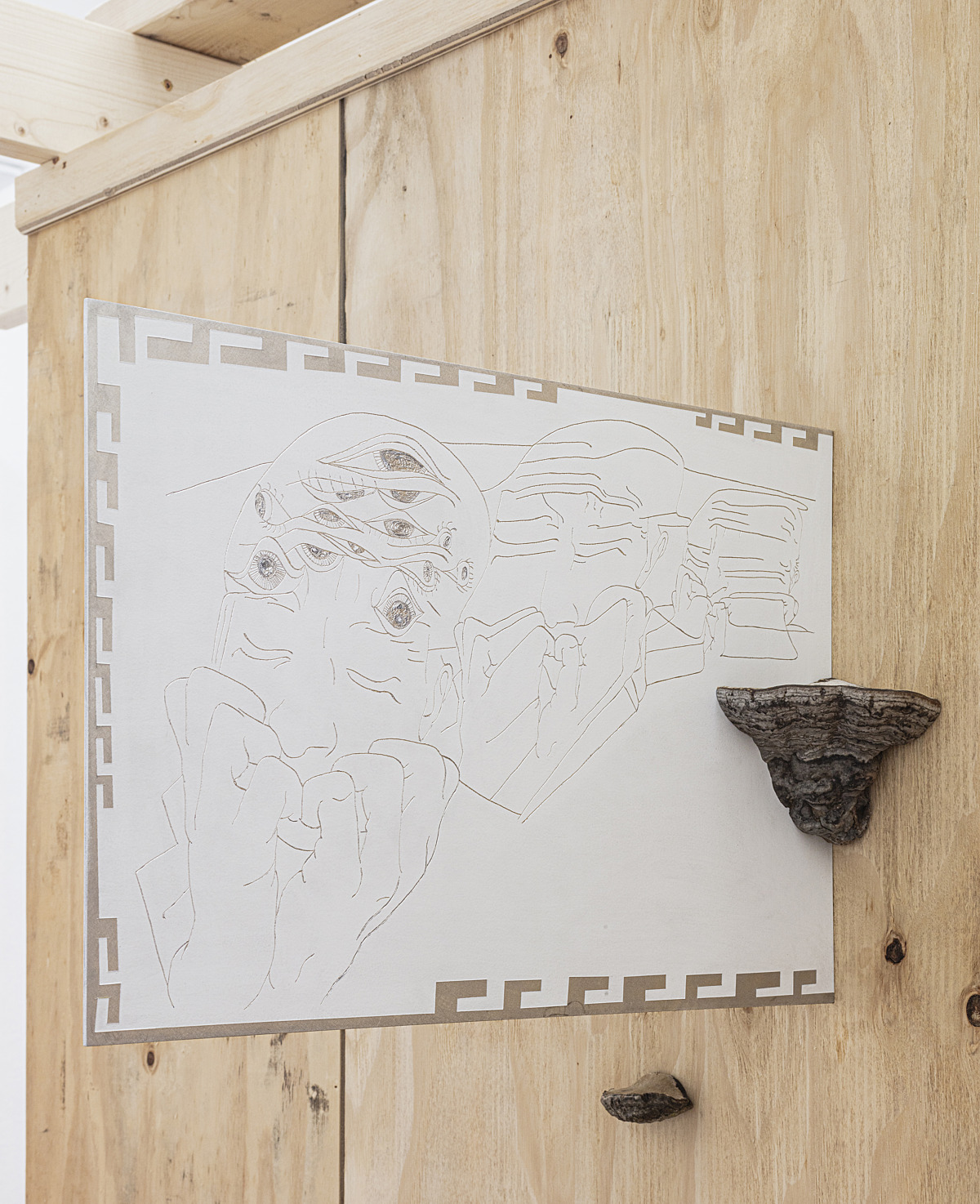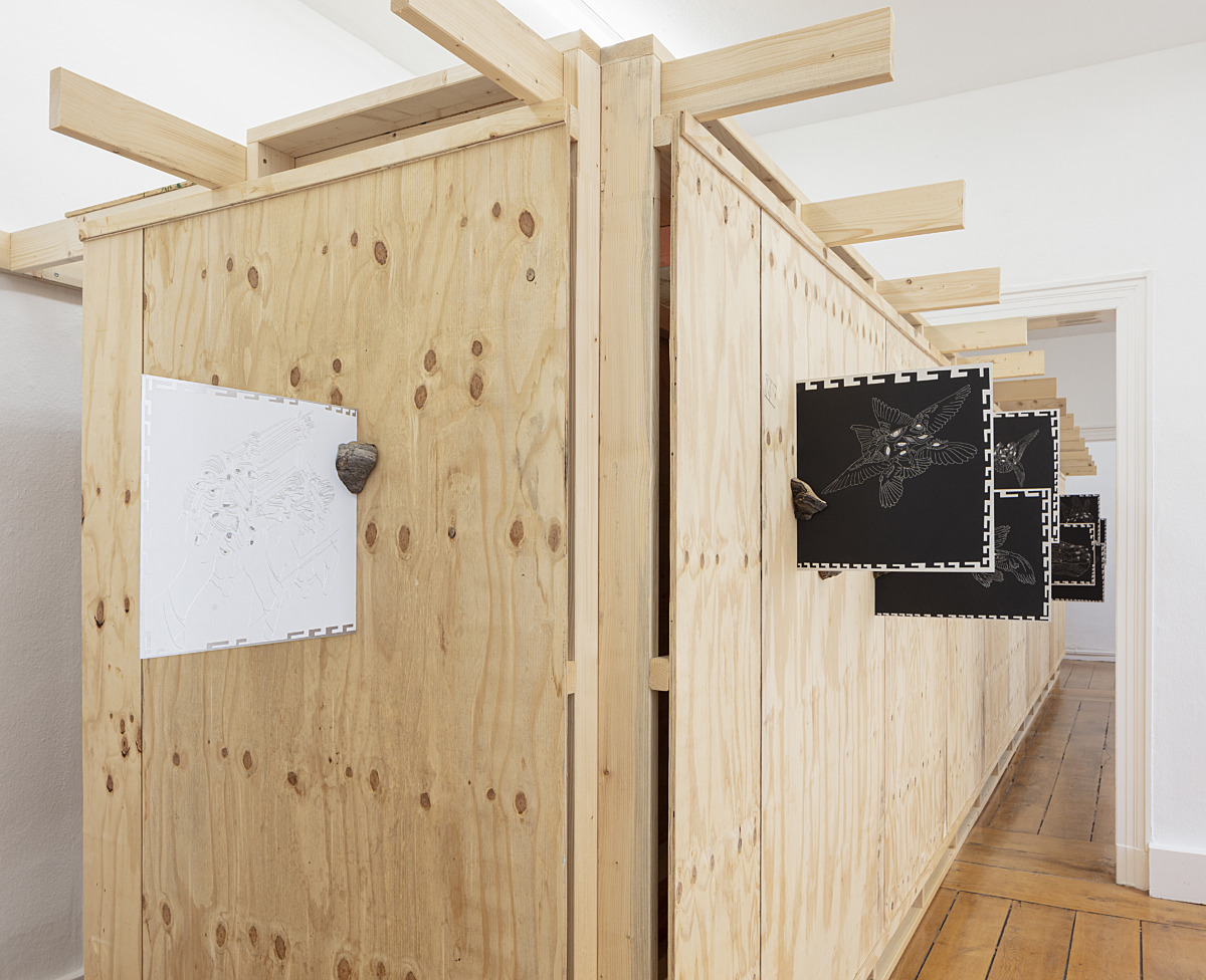 Visitors can enter the space behind through various openings. From inside to outside. A series of 12 line drawings, doubled and stretched thought images of time and space, can be seen here. (Speak In, Think Out, 2024). These works reflect the viewer's gaze from the inside (onto oneself) to the outside (into the surrounding space)."