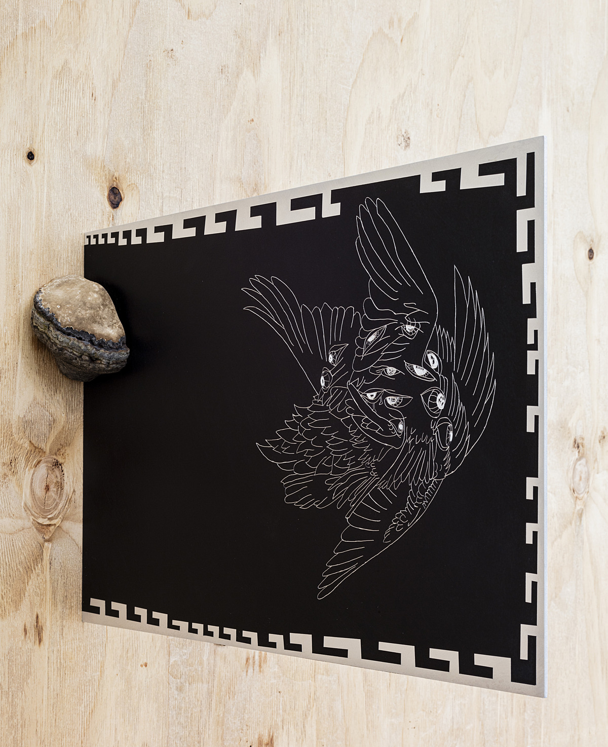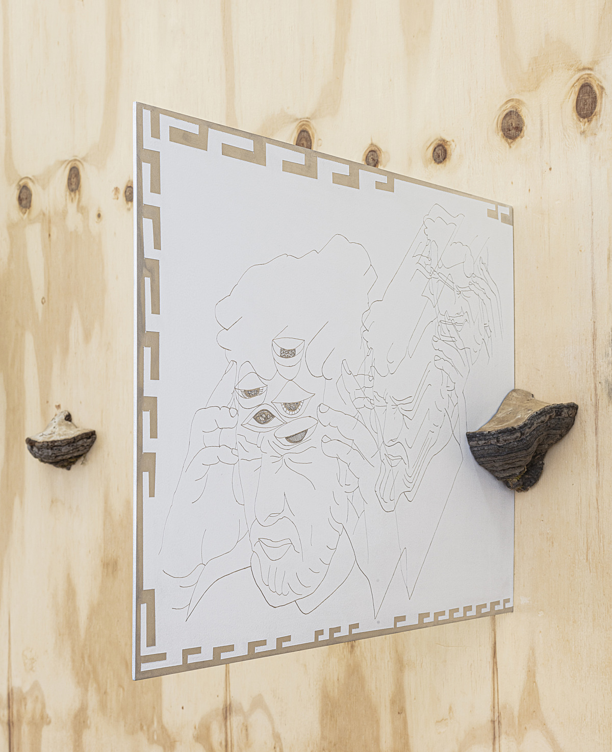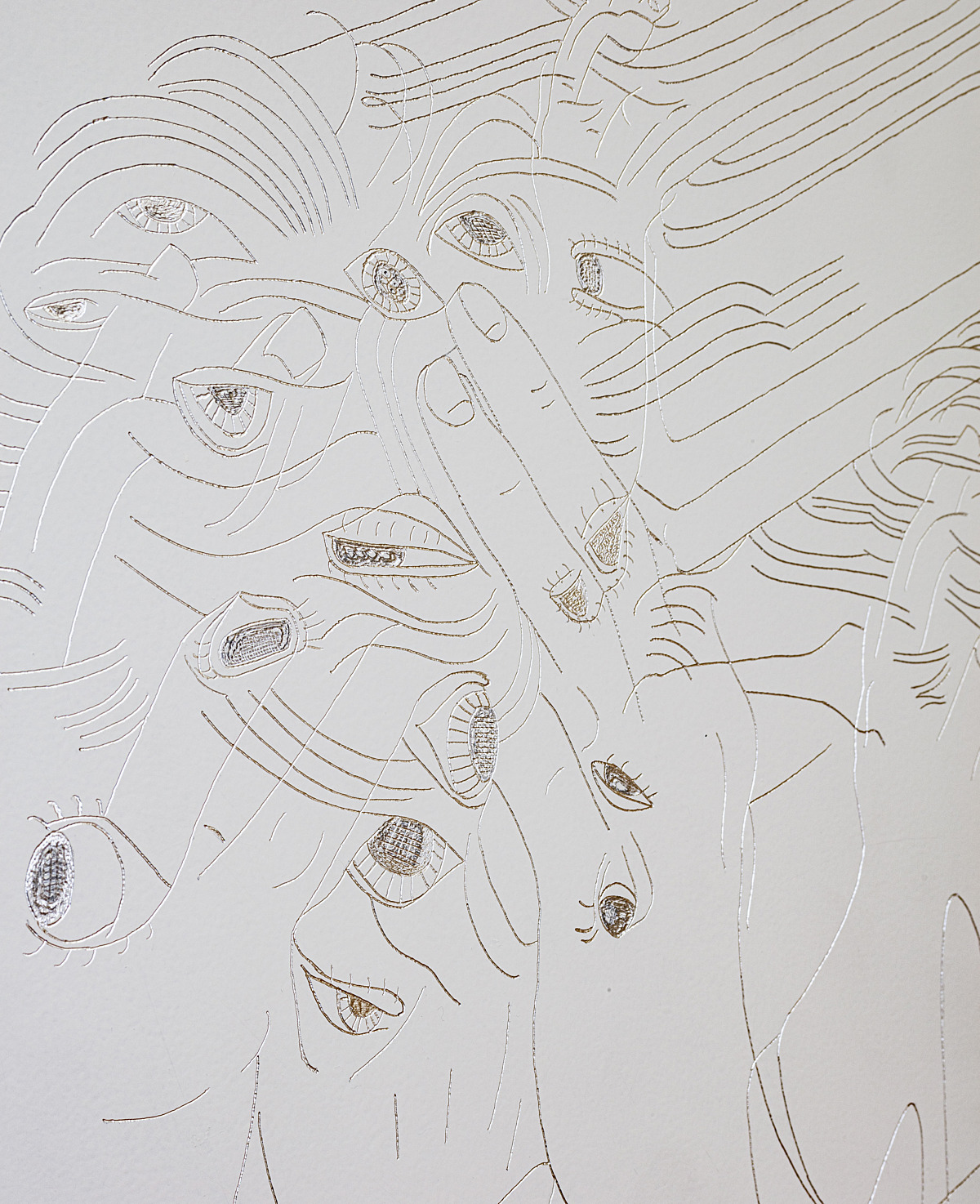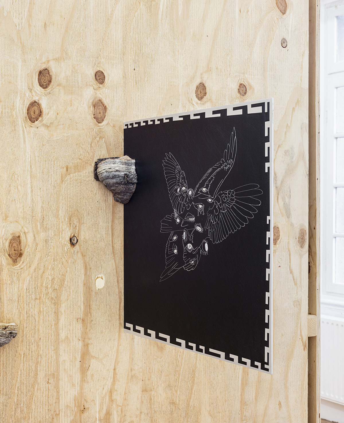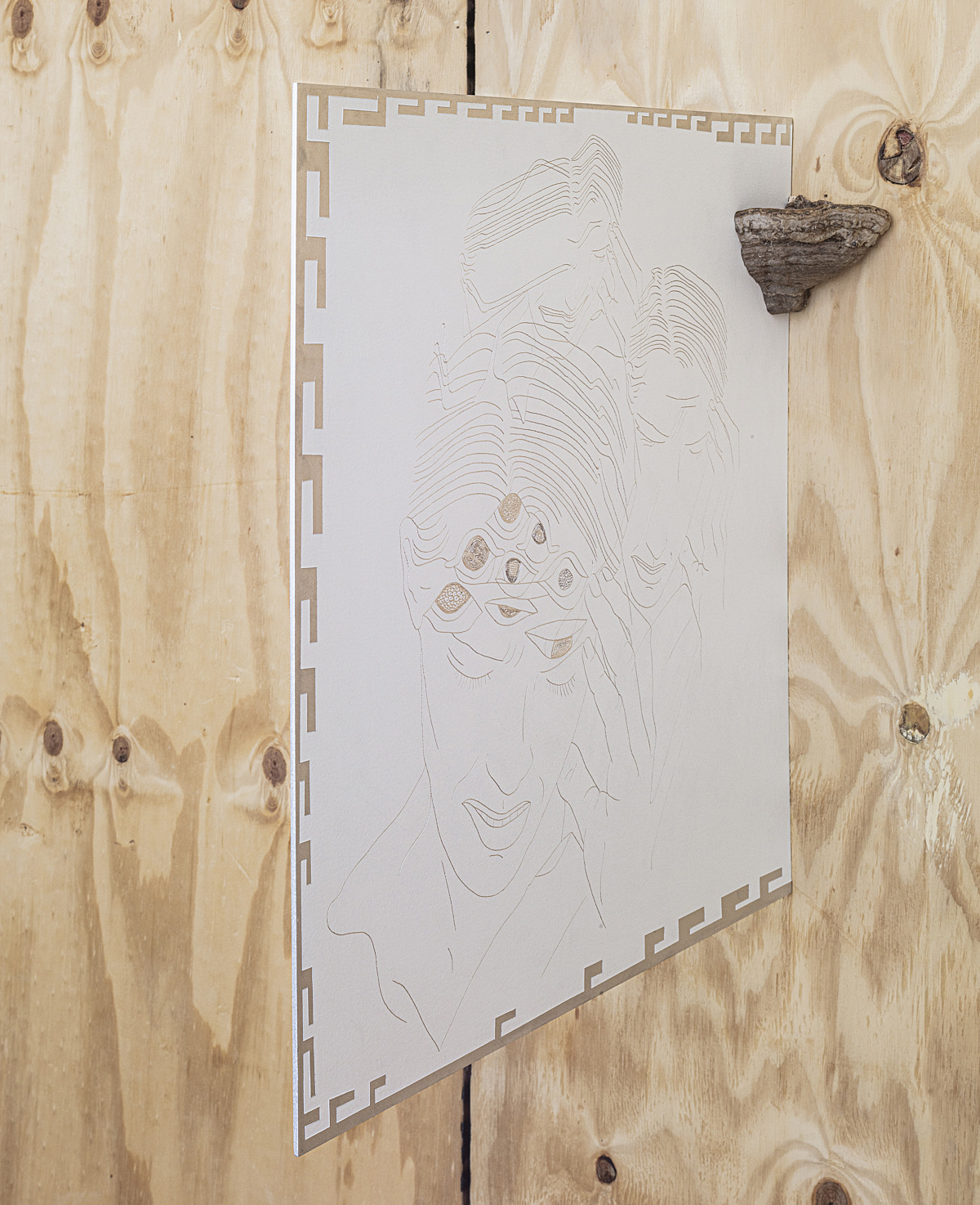 Visitors can enter the space behind through various openings. From inside to outside. A series of 12 line drawings, doubled and stretched thought images of time and space, can be seen here. (Speak In, Think Out, 2024). These works reflect the viewer's gaze from the inside (onto oneself) to the outside (into the surrounding space)."